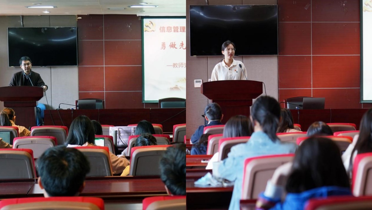 接下来以“勇做先锋模范,争做合格党员”为主题,教师党支部书记颜嘉麒教授和硕士生党员代表季云琪从自身经历出发,向新生党员分享经验。颜嘉麒强调作为学生党员,在思想政治上应关心国家大事,将学术研究与党建结合起来,未来发展应符合国家战略需求,对团队负责、对组织负责。季云琪认为党员应具备敬畏心、责任心和实干心,并希望新生党员能永葆青春力量,为国家事业奋斗终身。