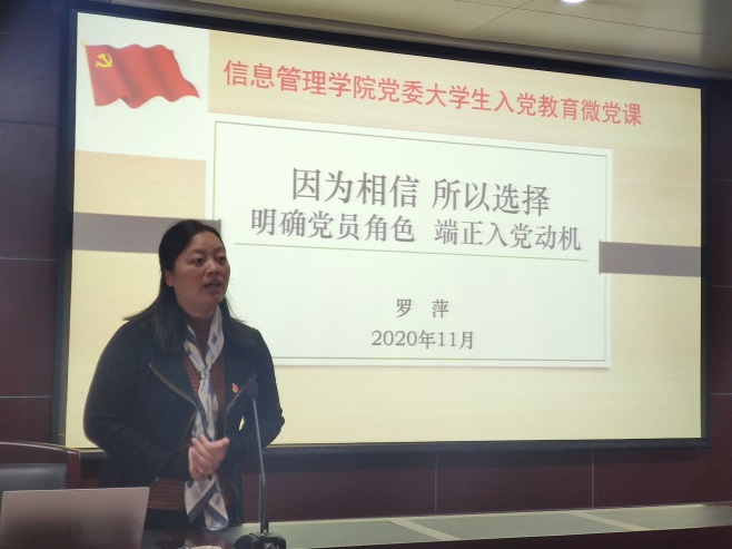 学院党委副书记罗萍老师和同学们分享了她对党员角色的认识,从正确认识党员身份、做合格党员的角度,引导同学们端正入党动机、正确把握党员角色要求。她首先以“学生党员应有的样子”为话题,挖掘学生党员的生动案例引发同学思考,进而指出一名合格的党员必须做到“四讲四有”:讲政治、有信念;讲规矩、有纪律;讲道德、有品行;讲奉献、有作为,并在同学中发挥先锋模范作用。罗老师通过角色理论与同学们探讨大学生党员的角色认知问题。她从角色的定义,到角色分类,再到认识大学生党员的角色认知与实践,层层深入,探讨新时代大学生党员应具备的道德品质与政治素养。她强调,同学们要充分理解党员发展的16字方针:坚持标准,保证质量,改善结构,慎重发展,要严格要求自己,不断努力学习,提升政治觉悟和综合素质。她鼓励同学们增强光荣感、责任感、使命感、成就感,在正确角色认知的基础上,实现成功的角色实践,做到言行一致、知行合一,达到身心的协调平衡,真正做到思想入党、行动入党、组织入党。