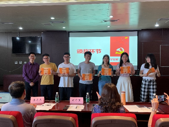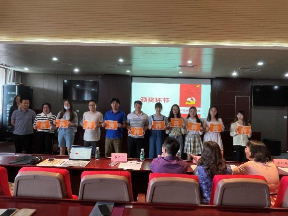 决赛开始前,首先为党史知识竞赛初赛获奖同学颁奖。团委书记李高杰与院长助理刘千里分别为获得“个人优秀奖”与“个人优胜奖”的同学颁奖。教工党支部委员陈铭与党委副书记罗萍分别为主题党日活动策划组织的先进个人与获奖支部颁奖。