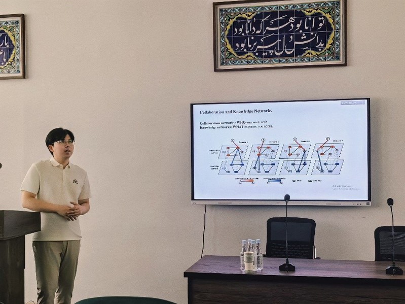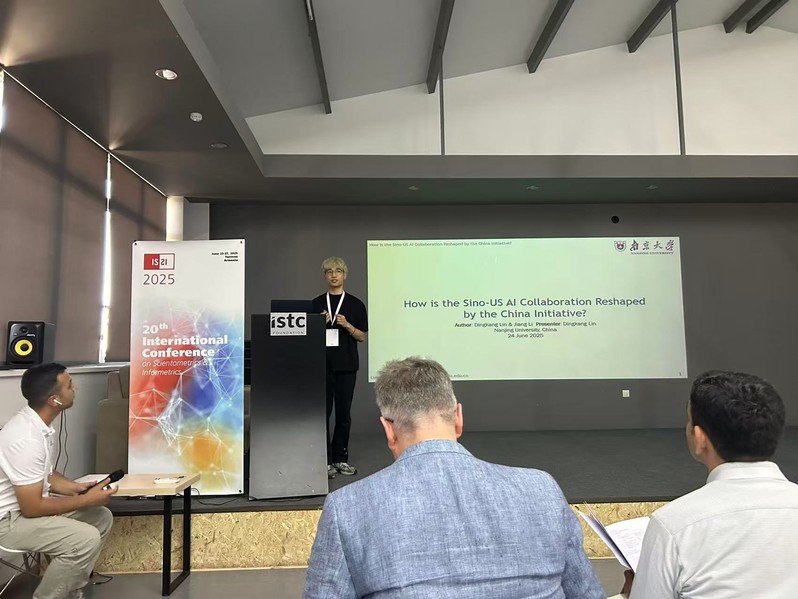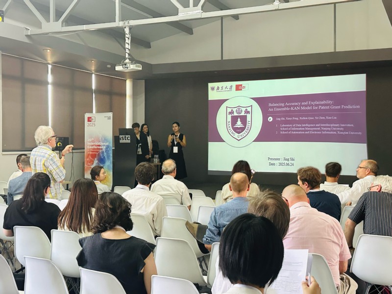 在科学计量与信息计量领域的最新进展。其中,博士后石静汇报了与陈烨助理教授合作的论文,题为“Balancing Accuracy and Explainability: An Ensemble-KAN Model for Patent Grant Prediction”,提出一种兼顾预测准确性与可解释性的专利授权预测模型,基于多领域数据进行实证分析,为可解释性模型在专利计量领域的应用拓展提供了有益实践与理论启示。博士生王嘉杰汇报了与硕士生程晓灵合作的论文,题为“Network Position Matters: Collaborative Strategies, Talent Mobility, and Exploratory Innovation in Teams”,探讨团队合作网络中的成员位置如何在人才流动背景下影响探索式创新行为,深化了对协作创新机制的理解。博士生杨杰在AII-EEKE工作坊线上汇报了与邓三鸿教授等合作的工作论文(线上),题为“Measuring Technology Diffusion Dynamics Using Patent Full-Text Data and Machine Learning”,探索了如何基于PatentBERT等机器学习模型来量化技术创新和动态扩散。博士生李悦报告了与康乐乐教授合作的论文,题为“Unveiling the Temporal Dynamics: The Impact of Knowledge Source Diversity, Breadth and Depth on Disruptive Innovation through Time-Series Analysis”,通过构建时间序列分析框架,揭示了知识来源的多样性、广度与深度对颠覆性创新的影响路径,为理解知识结构演化与高影响力创新之间的关系提供了理论参考。博士生林定康作报告“How is the Sino-US AI Collaboration Reshaped by the China Initiative?”,聚焦中美人工智能合作网络的结构变迁,系统分析了政策冲击对国际科研协作格局的影响。