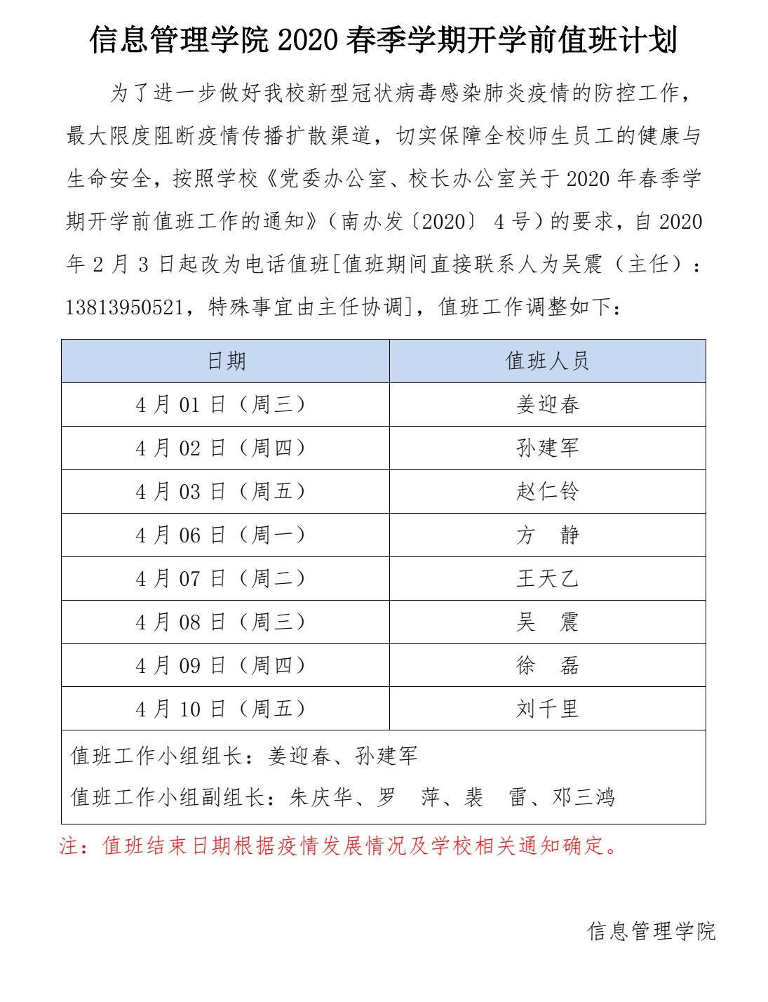 禁闻网 2020春季学期开学前值班计划(4月份)