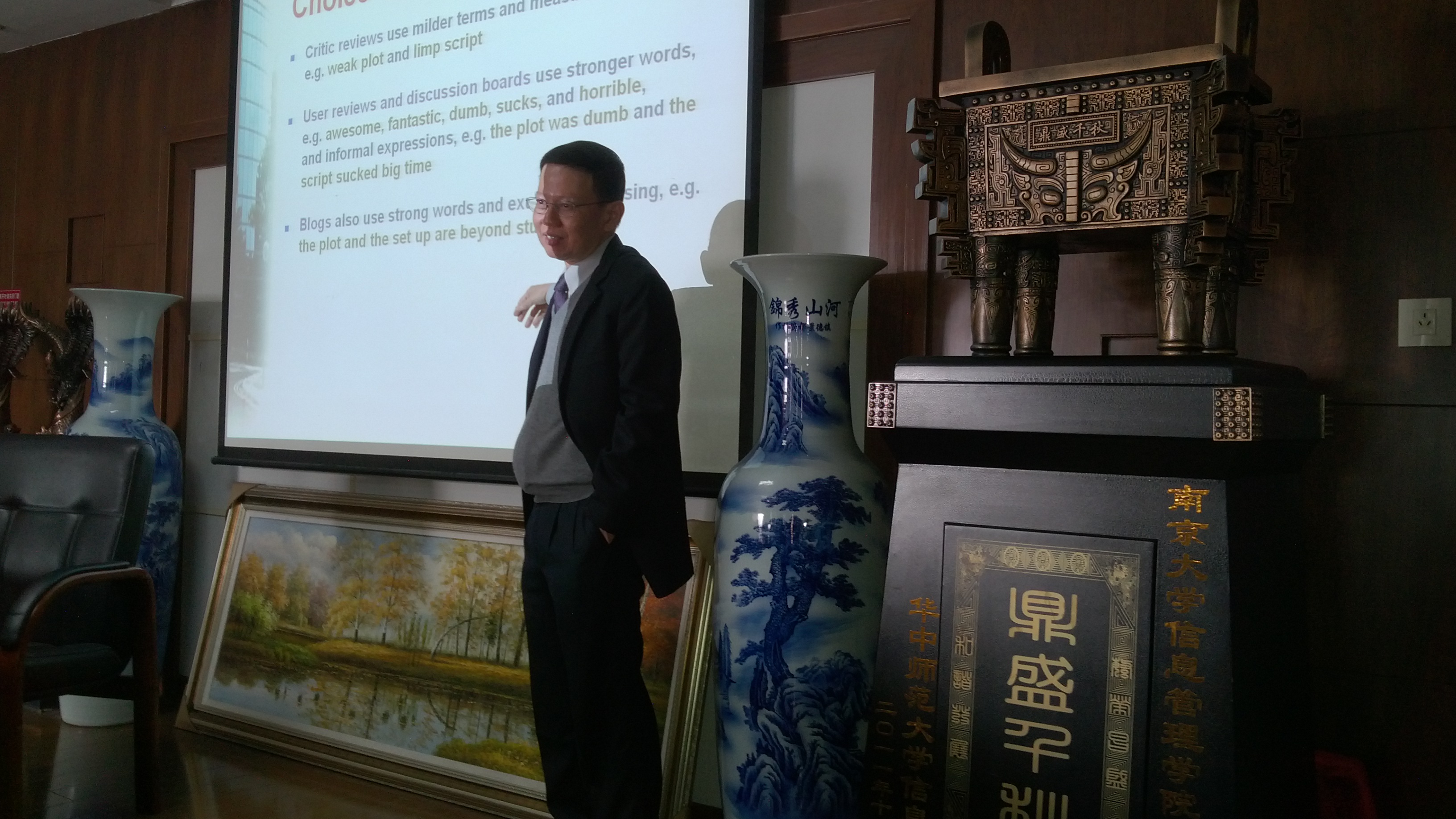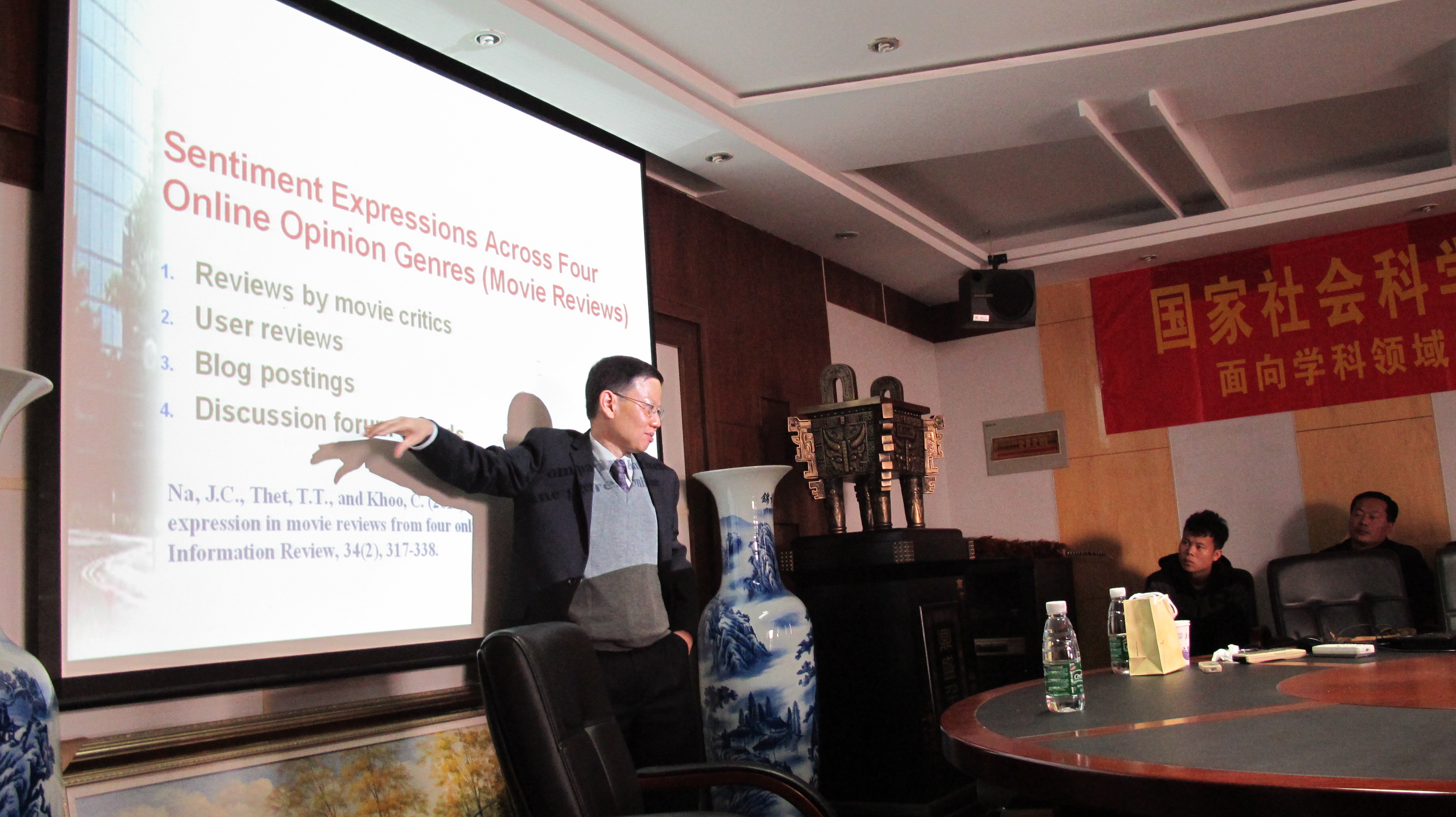 2012年3月27日至28日,新加坡南洋理工大学传播与信息学院Christopher Khoo教授访问了禁闻网 ,并为禁闻网 师生做了题为“Linguistic Approach to Sentiment Analysis”的学术报告,使同学们了解到了情感分析这一热门研究领域的主要方法与最新研究进展, 来自南京航空航天大学和南京理工大学相关院系的部分师生也前来聆听了报告。