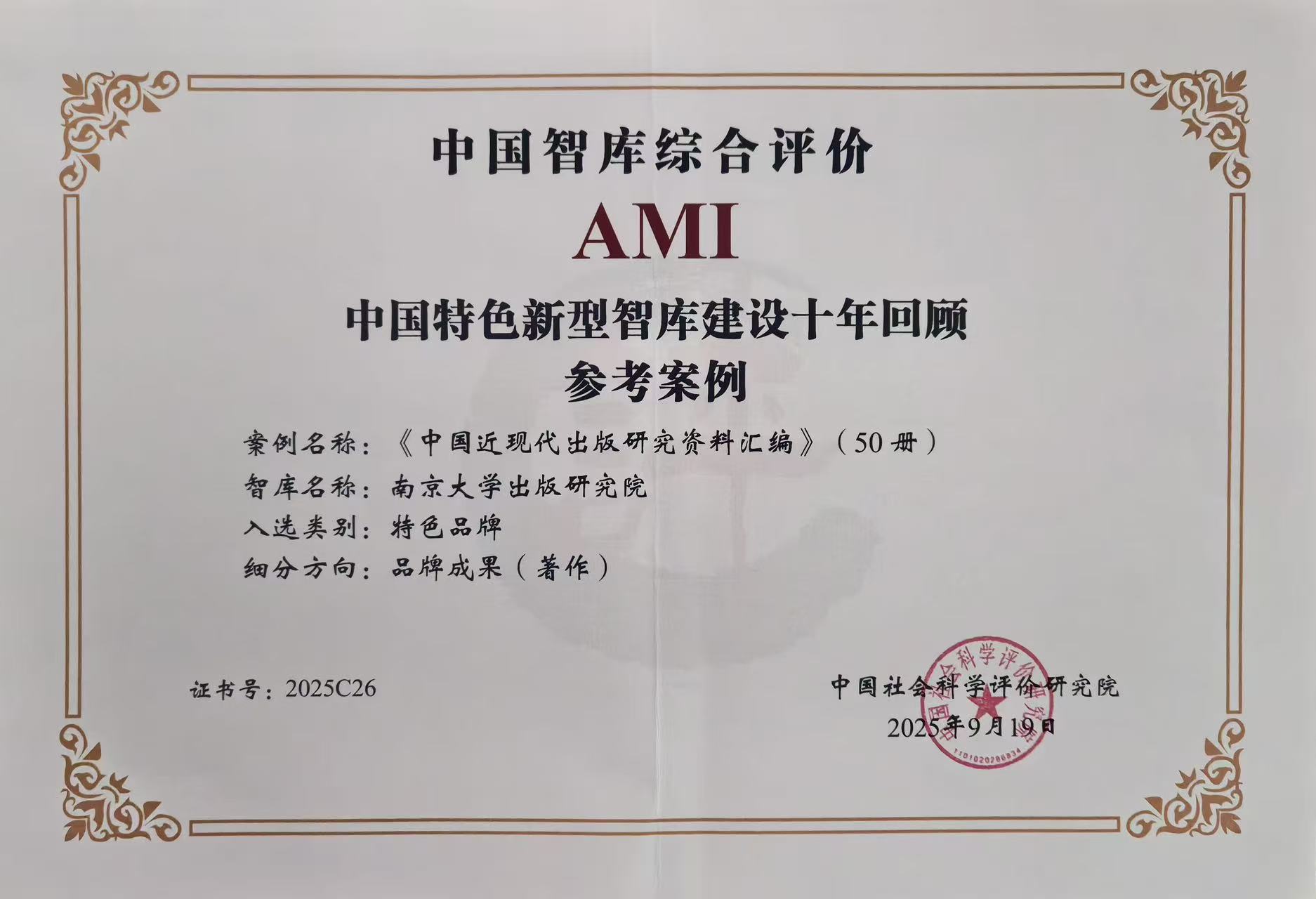 出版研究院入选“中国智库综合评价2025年AMI智库”名单,研究院案例“中国近现代出版研究资料汇编(50册)”荣获“中国特色新型智库建设十年回顾参考案例”。