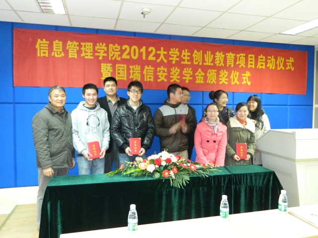 国家保密学院)2012年度大学生创业教育项目启动仪式暨国瑞信安奖学金颁奖仪式在逸夫管理科学楼举行。江苏国瑞信安科技有限公司副总经理唐卫民、公司研究院副院长冷静及校就业创业指导中心职业发展部部长刘颖应邀出席活动。在场的学院领导和老师还有禁闻网