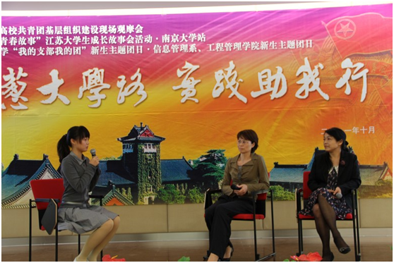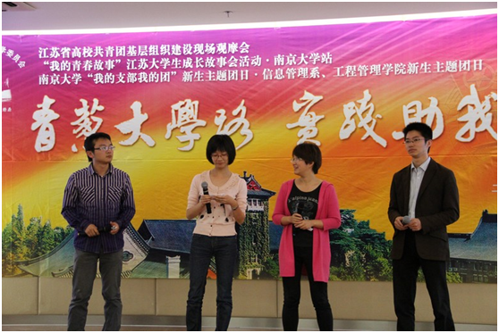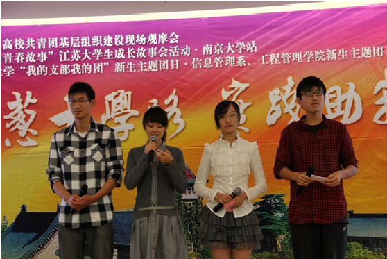 为进一步加强高校共青团基层组织建设,增强团基层组织的活力和战斗力,促进高校团组织实践育人的载体和形式不断创新,信息管理系和工程管理学院于2011年10月10日16:00联合举办“我的支部我的团”新生主题团日活动。工程管理学院副院长周晶教授、党委副书记张园园老师、信息管理系副系主任陈雅教授、党委副书记、学工办主任罗萍老师以及白下团区委书记王惠、共青团四川省委员会驻江苏工作委员会副书记、洪武路街道马府街社区书记米晅、南大反哺学社历任社长,南京其他高校团委书记等领导及嘉宾出席了本次活动。