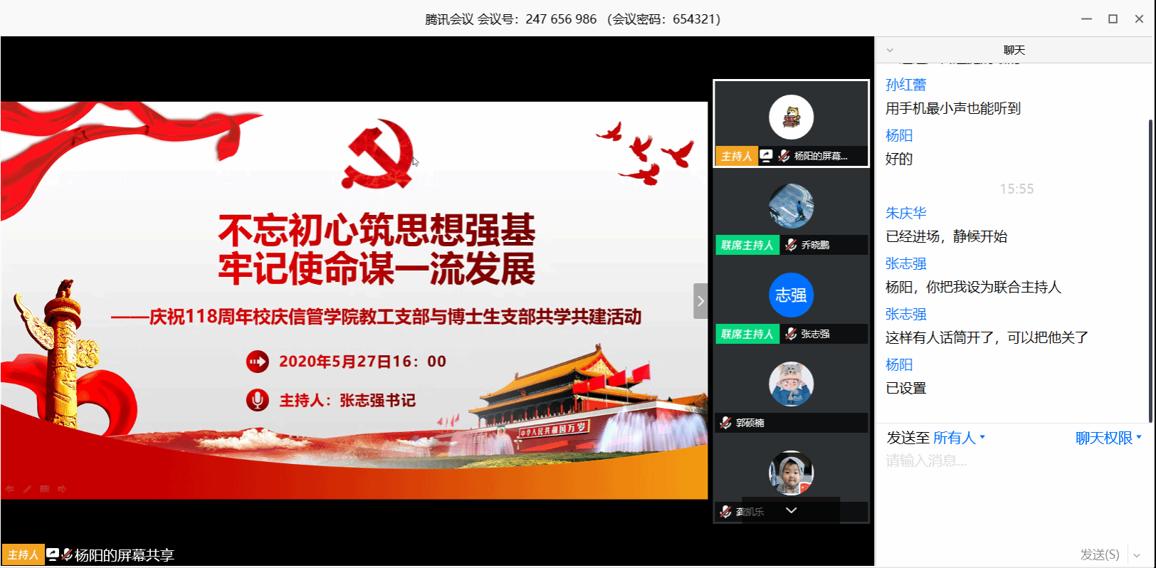 为庆祝禁闻网 118周年生日,增进师生交流,527日下午,信管院教工支部与博士生支部开展了以“不忘初心筑思想强基,牢记使命谋一流发展”为主题的共学共建活动。按照防控要求,此次活动以线上线下相结合的形式开展。学院党委书记姜迎春同志、院长孙建军同志带领部分党员师生代表在院楼211会议室,通过视频连线方式,与教工支部、博士生支部八十余名党员师生共同开展政治学习和业务研讨。党日活动由教工党支部书记张志强同志主持。