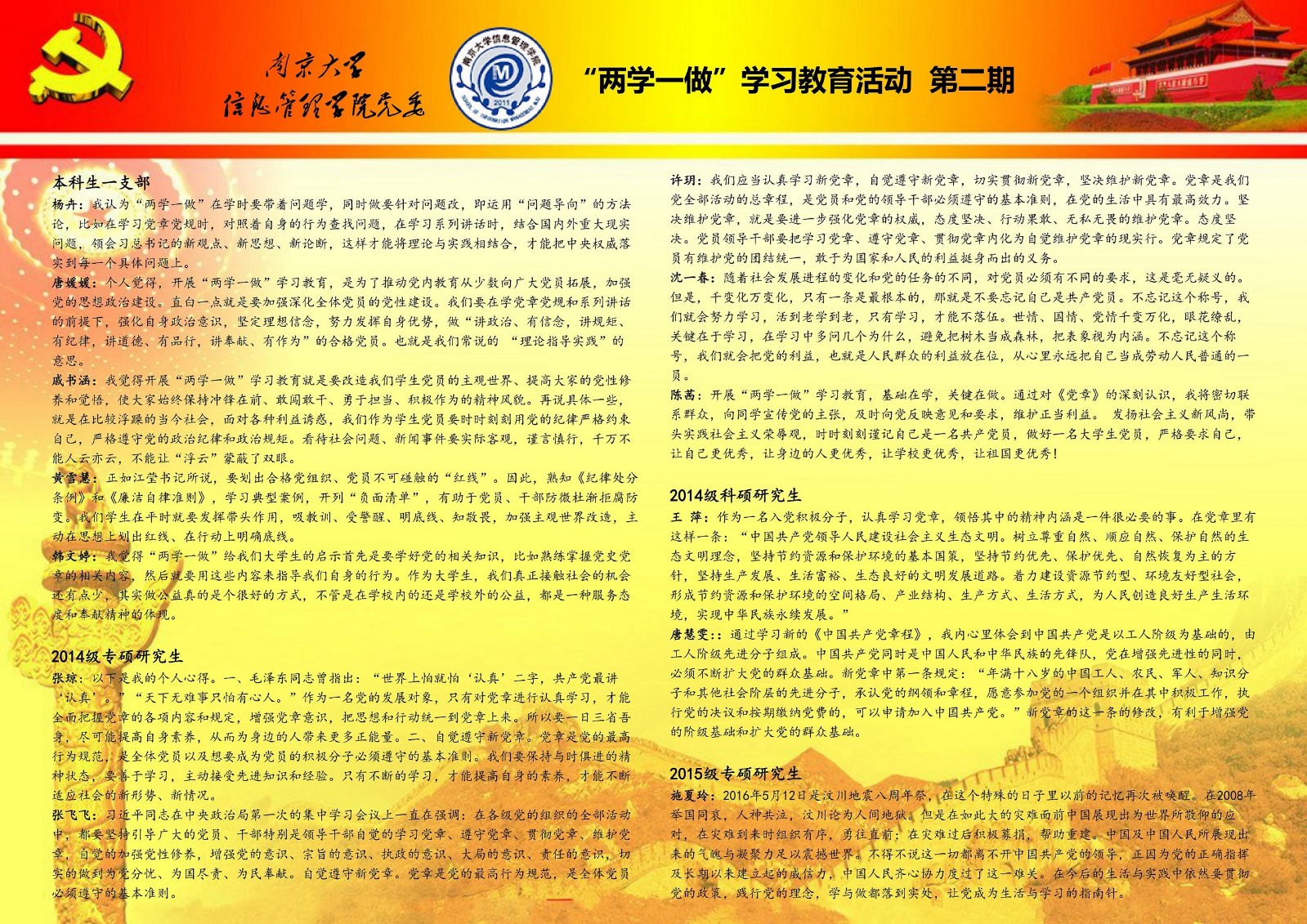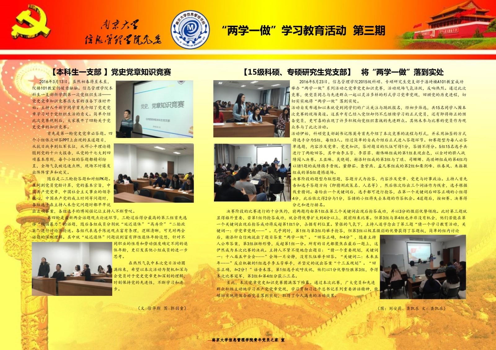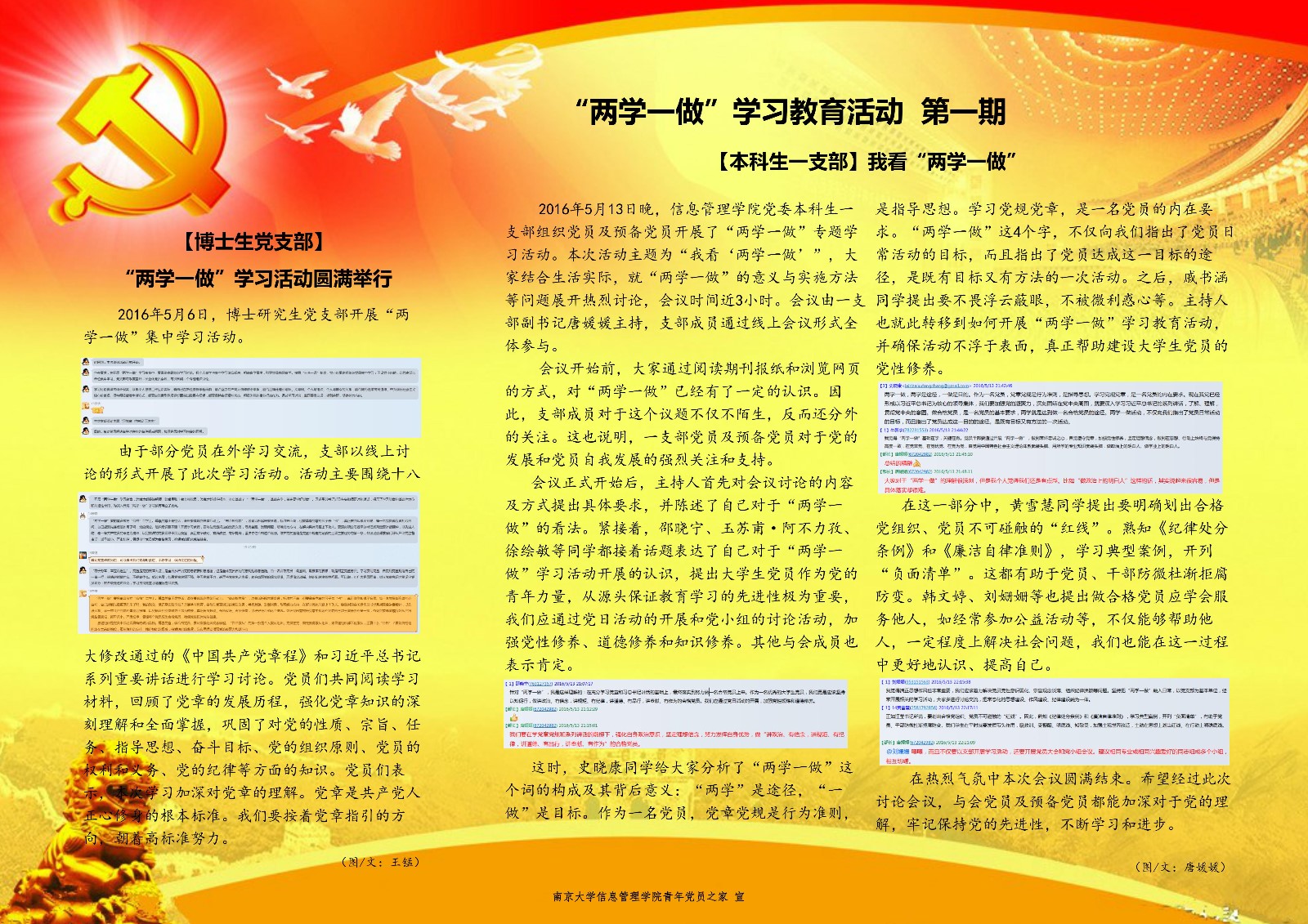 根据学校《方案》要求,学院党委在4月底5月初,在全院党员师生中组织开展以“讲政治、有信念”为主要内容的专题学习研讨活动。顺应互联网+的时代背景,院党委鼓励各支部充分利用新媒体,创新学习教育活动形式,做到线上线下良性互动、共同推进,以提高学习实际效果为首要标准。坚持党员师生自学和集体学习相结合。围绕党章党规和习近平总书记系列讲话学习专题,教工党支部4月底专门召开党员大会,开展集中学习;博士生党支部和本科生一支部分别在5月6日和5月13日通过QQ群展开了学习心得的线上交流,2015级专硕党支部与科硕党支部则分别于5月12日和16日在潘琦楼召开了“两学一做”面对面专题分享会。全院党员师生初步了解了“两学一做”学习教育活动的背景意义和主要内容,学习氛围日渐浓厚。