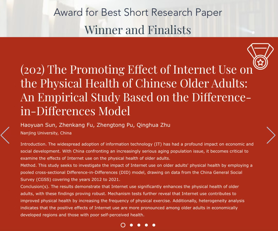 近日,由23级研究生孙浩源、23级博士生付振康和23级研究生蒲政同与指导教师朱庆华教授共同完成的会议论文The Promoting Effect of Internet Use on the Physical Health of Chinese Older Adults: An Empirical Stud...